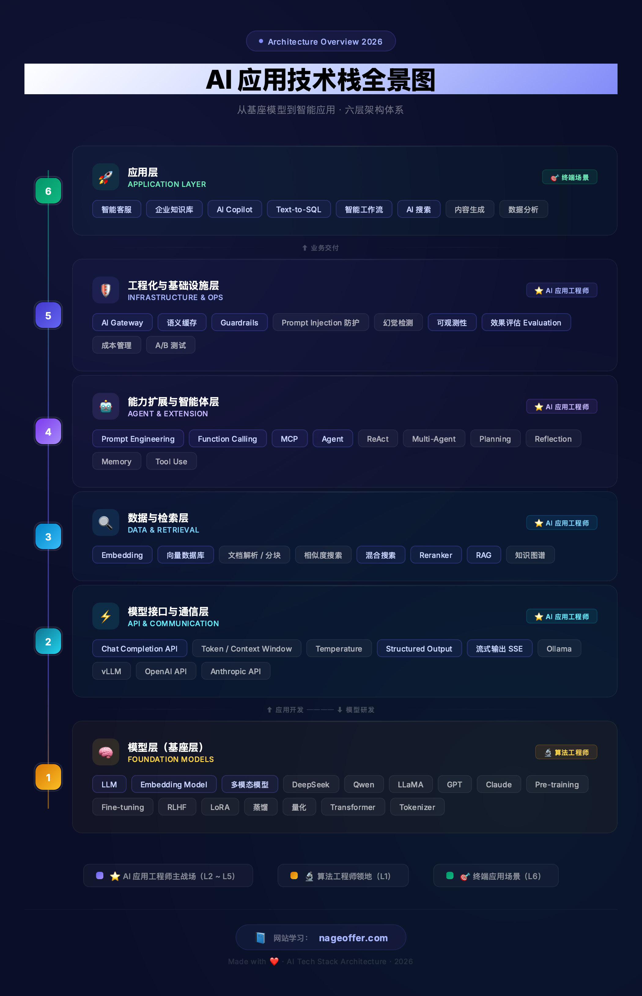 AI 技术体系的概念很多,但它们不是散的——有清晰的分层结构。就像后端技术栈有数据库层、缓存层、服务层、网关层一样,AI 技术栈也是一层一层搭上去的。