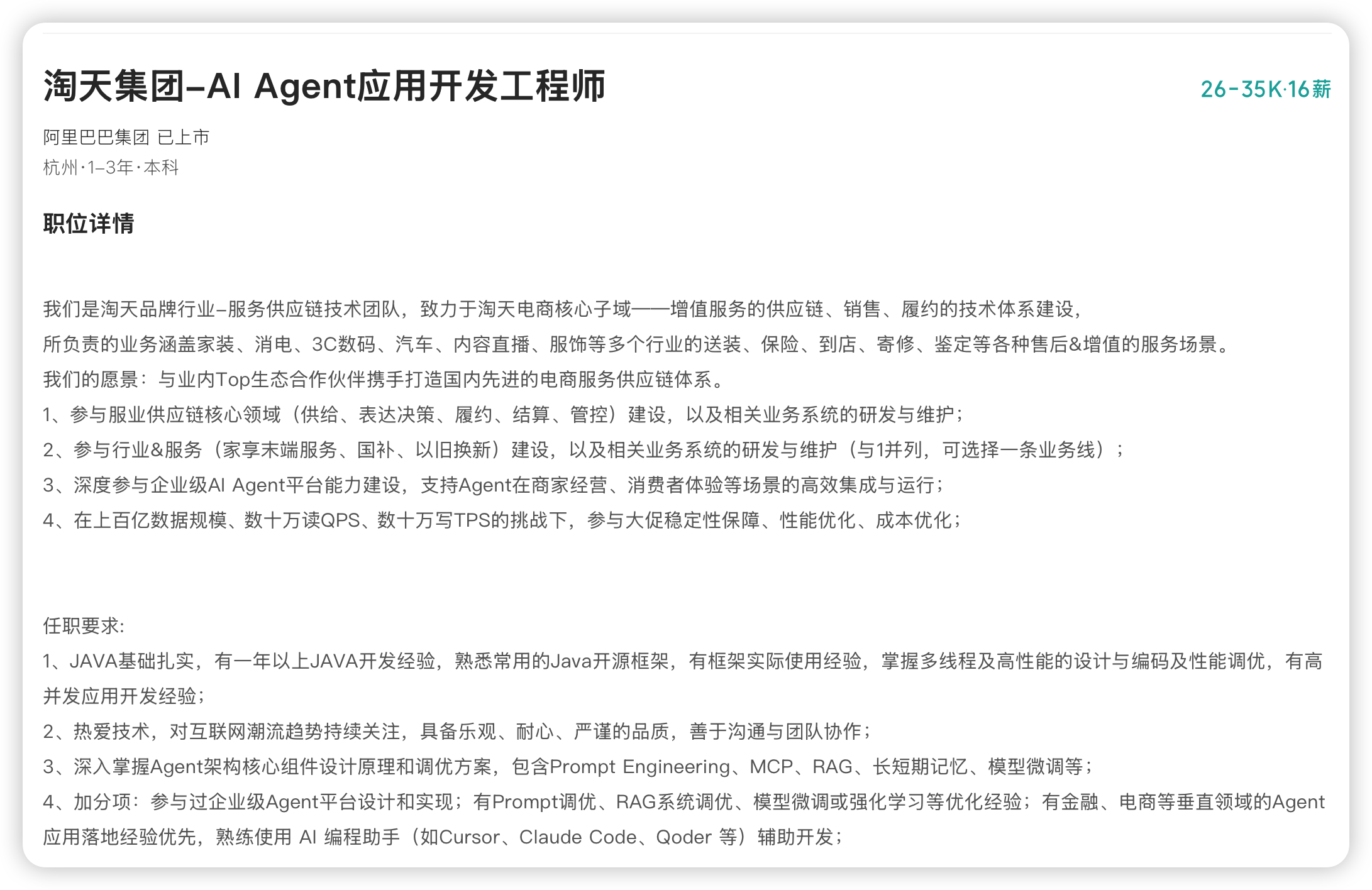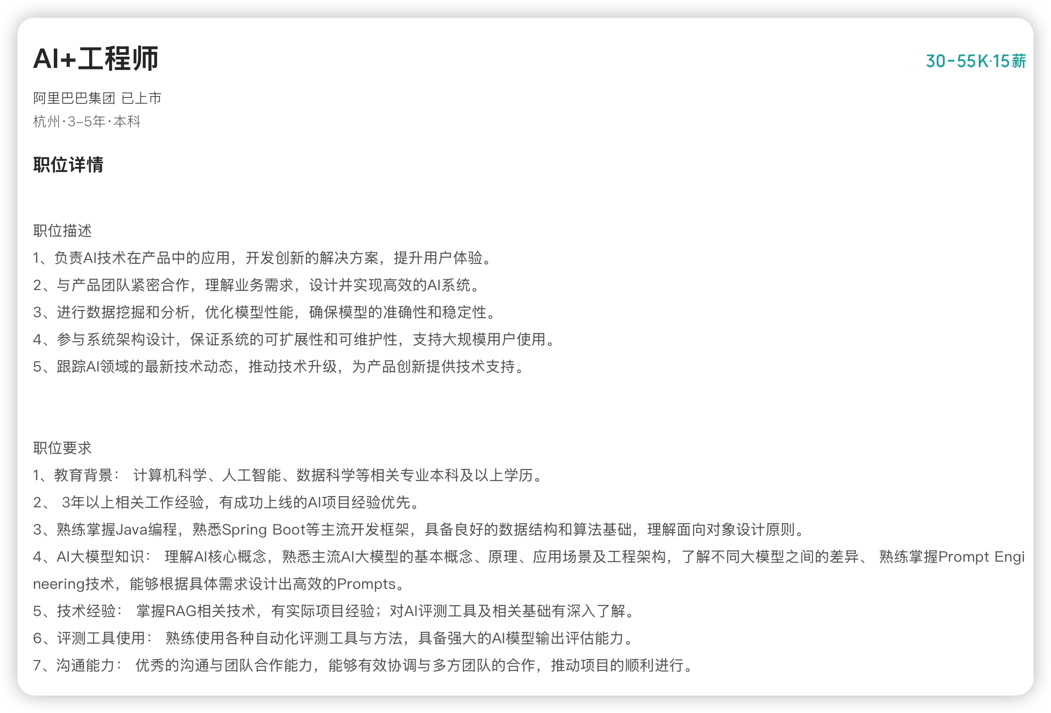 以阿里巴巴举例,AI Agent 工程师的招聘要求:在后端工程师基础上,加了部分 AI 能力。如果你做过 1-2 个有深度的 RAG、Agent 项目,基本上都能涵盖到对应的技术栈。