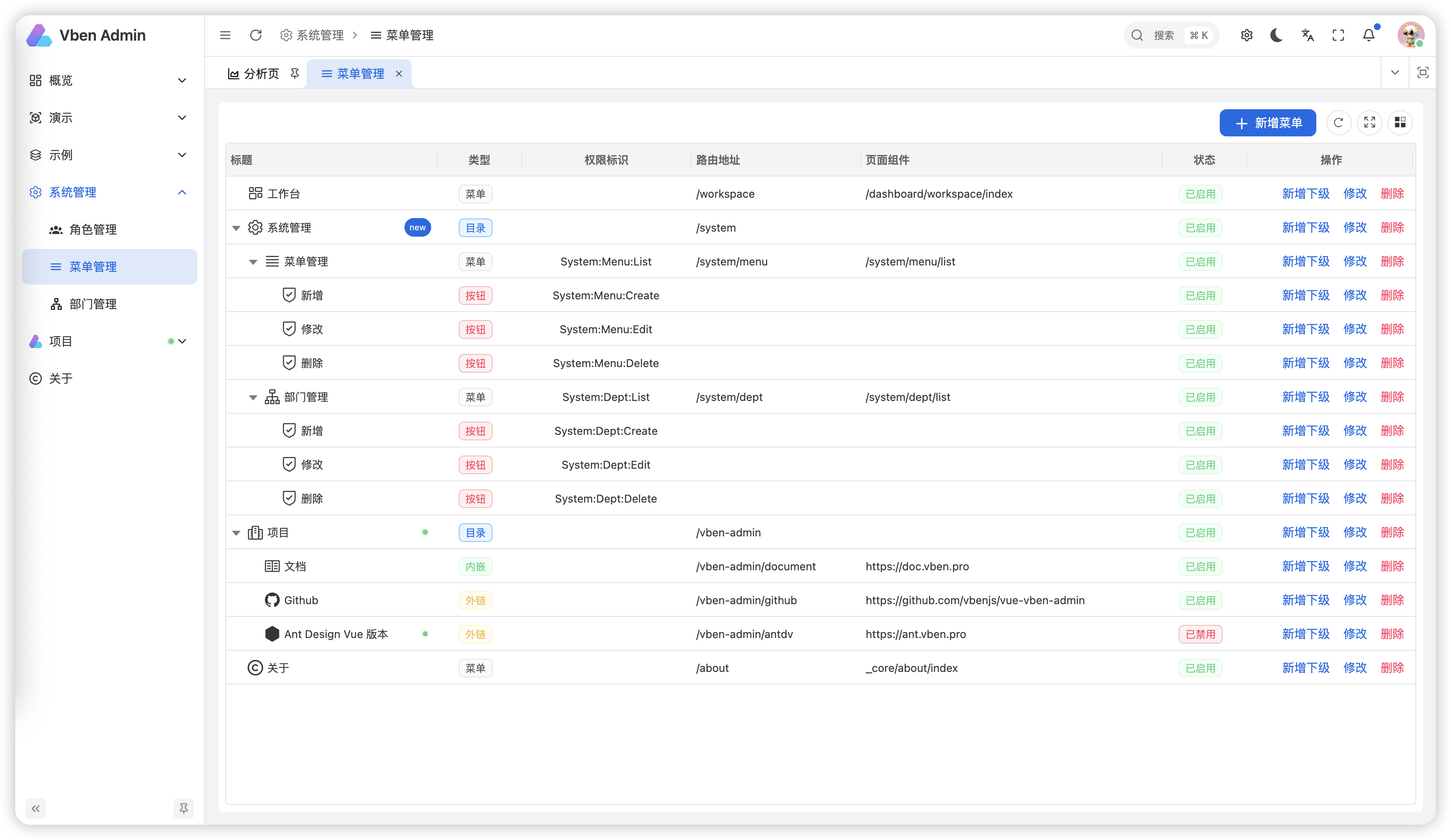 Vben Admin 是一个基于 Vue 3 + Vite + TypeScript + Ant Design Vue 的现代化中后台前端解决方案。它采用最新的前端技术栈,提供完善的工程化配置和丰富的内置功能,例如动态路由、权限管理、国际化支持、组件封装、Mock 数据、主题切换等。