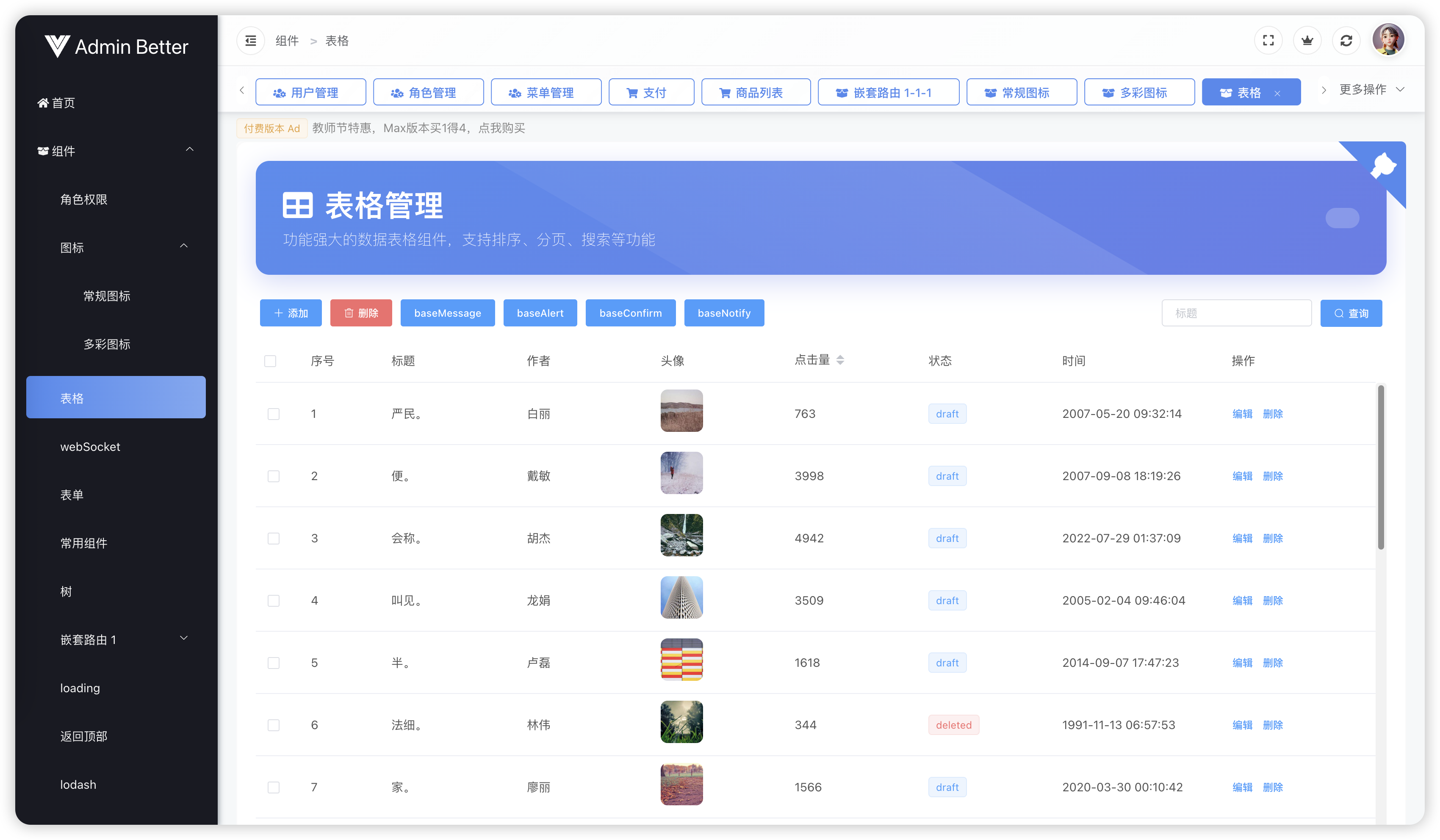 vue-admin-better 是一个基于 Vue 2.x(也支持 Vue3.x) + Element UI 的后台管理系统模版,主打开箱即用和功能丰富。它提供常见的后台管理功能,如动态菜单、权限管理、国际化、多主题、多环境配置等,是 Vue 生态里非常成熟的解决方案之一。
