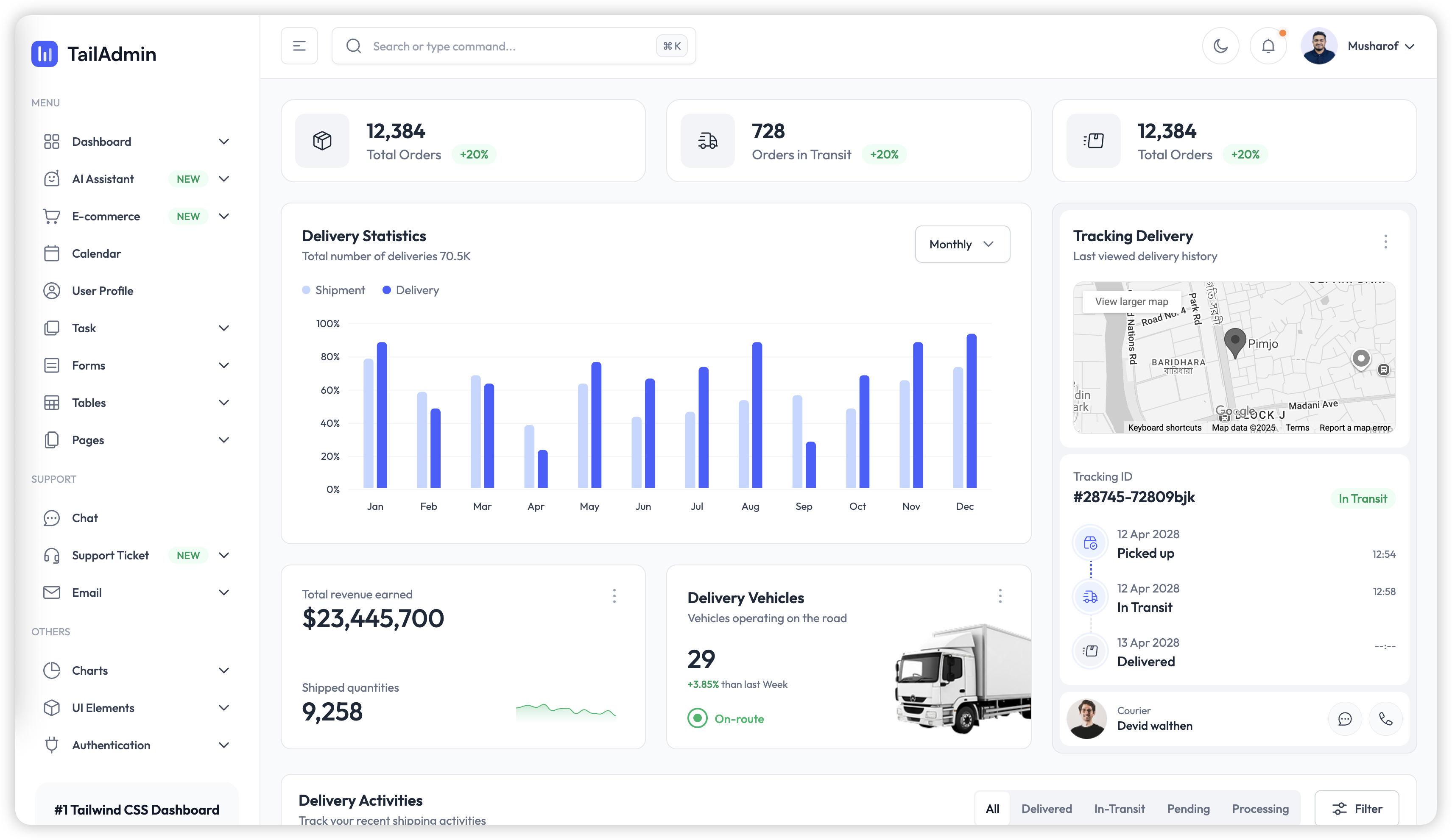 TailAdmin 是一个基于 Tailwind CSS 构建的免费现代化后台管理仪表板模板。它采用简洁高效的工具类 CSS 风格,提供美观的 UI 界面和常见管理面板组件,开箱即用。TailAdmin 同时提供免费版和 Pro 版,前者包含基础仪表盘、表格、表单、图表等组件,适合快速构建后台原型;Pro 版则扩展了更多页面模板和 UI 元素,适合更复杂的项目需求。