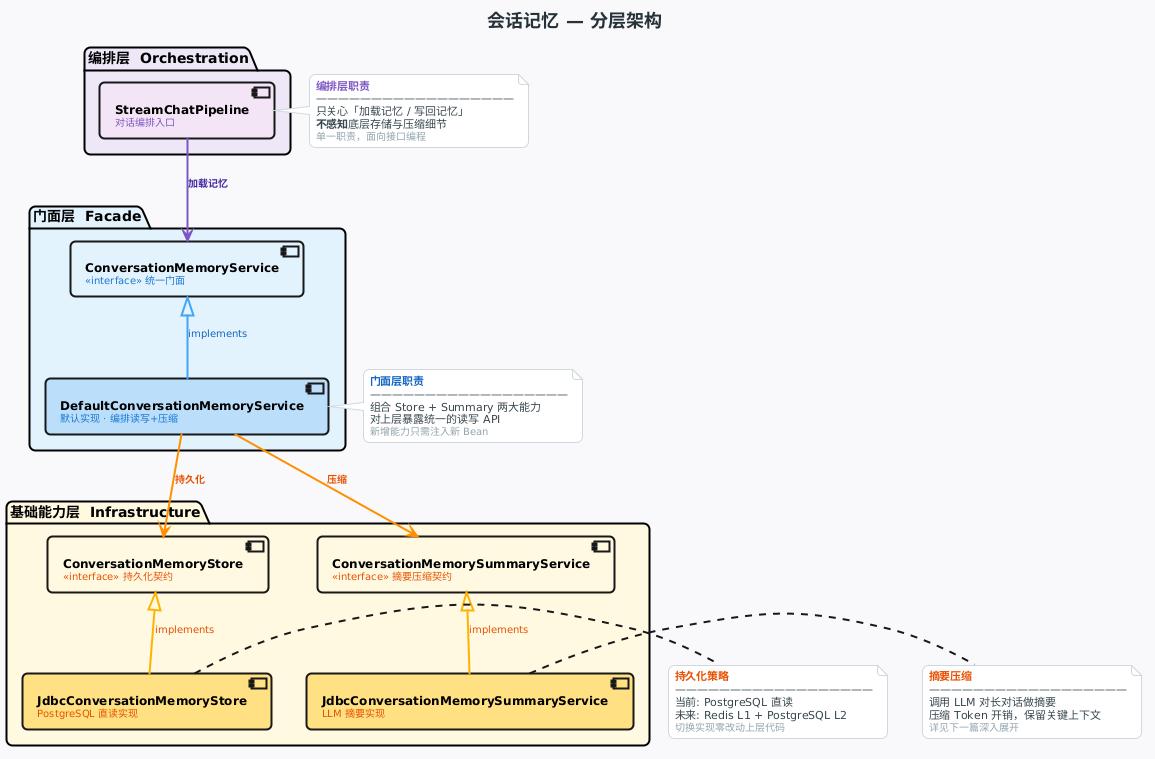 编排层只关心结果。 Pipeline 调 loadMemory 拿到一个 List<ChatMessage> 就够了,它不需要知道这个列表是从 PostgreSQL 查出来的还是从 Redis 拿的,也不需要知道里面有没有摘要。