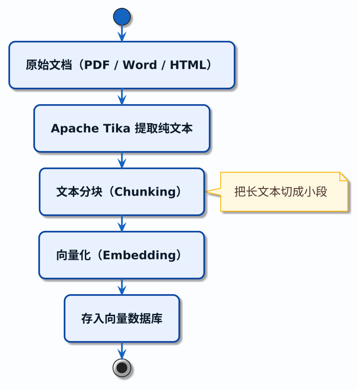 上一篇我们用 Apache Tika 从 PDF、Word 等文件中提取出了纯文本。但纯文本只是原材料,还不能直接用于检索。分块是紧接着文本提取之后的一步,它把长文本切成适合检索的小段。