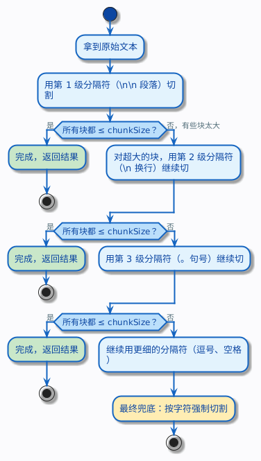 chunkSize 就是每个块的长度上限。比如你设 chunkSize = 200,意思是每个块最多包含 200 个字符(或 200 个 token,取决于你用什么单位,后面会说)。