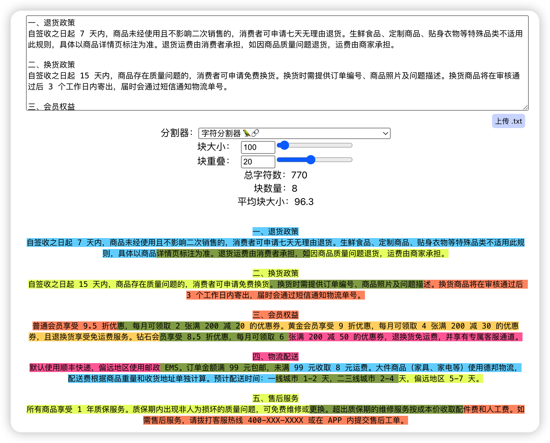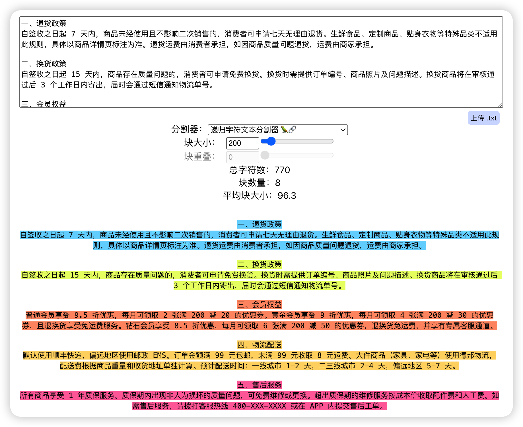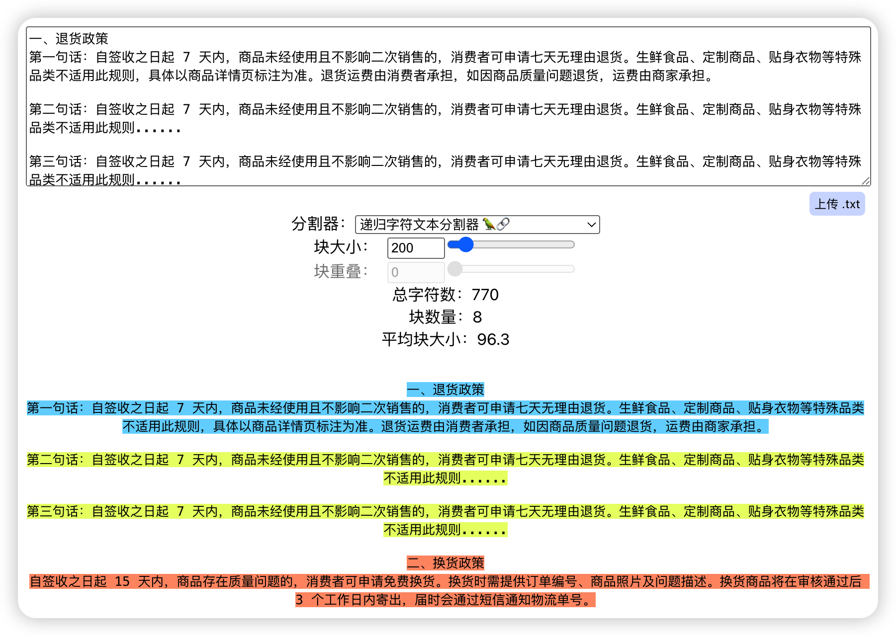 - 块太小(比如 50 字):每个块很精准,但可能把一个完整的意思切断了,上下文丢失。就像把一条退货规则从中间劈开,前半句和后半句单独看都不知道在说什么。